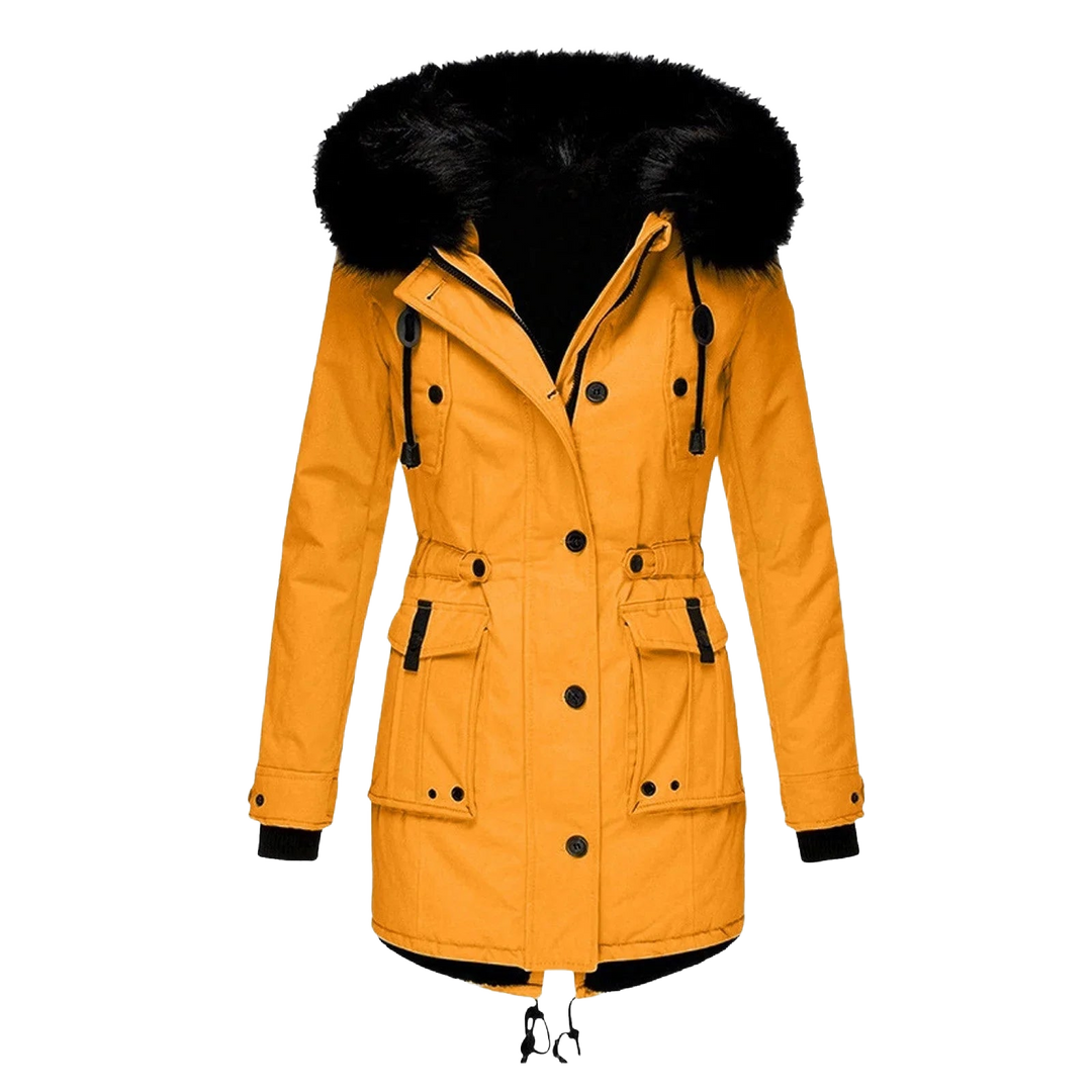 Damen Winterjacke mit Kunstfell Kapuze und verstellbarer Taille