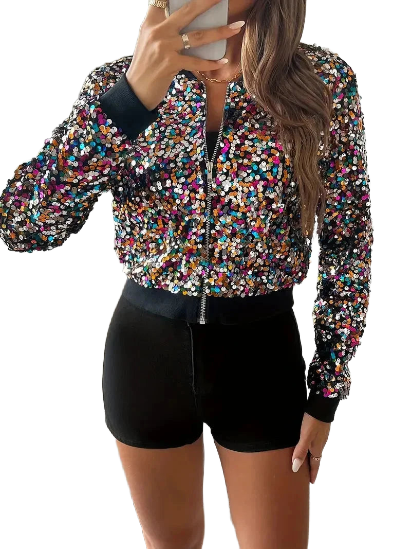 Damen Pailletten Bomberjacke mit Reißverschluss