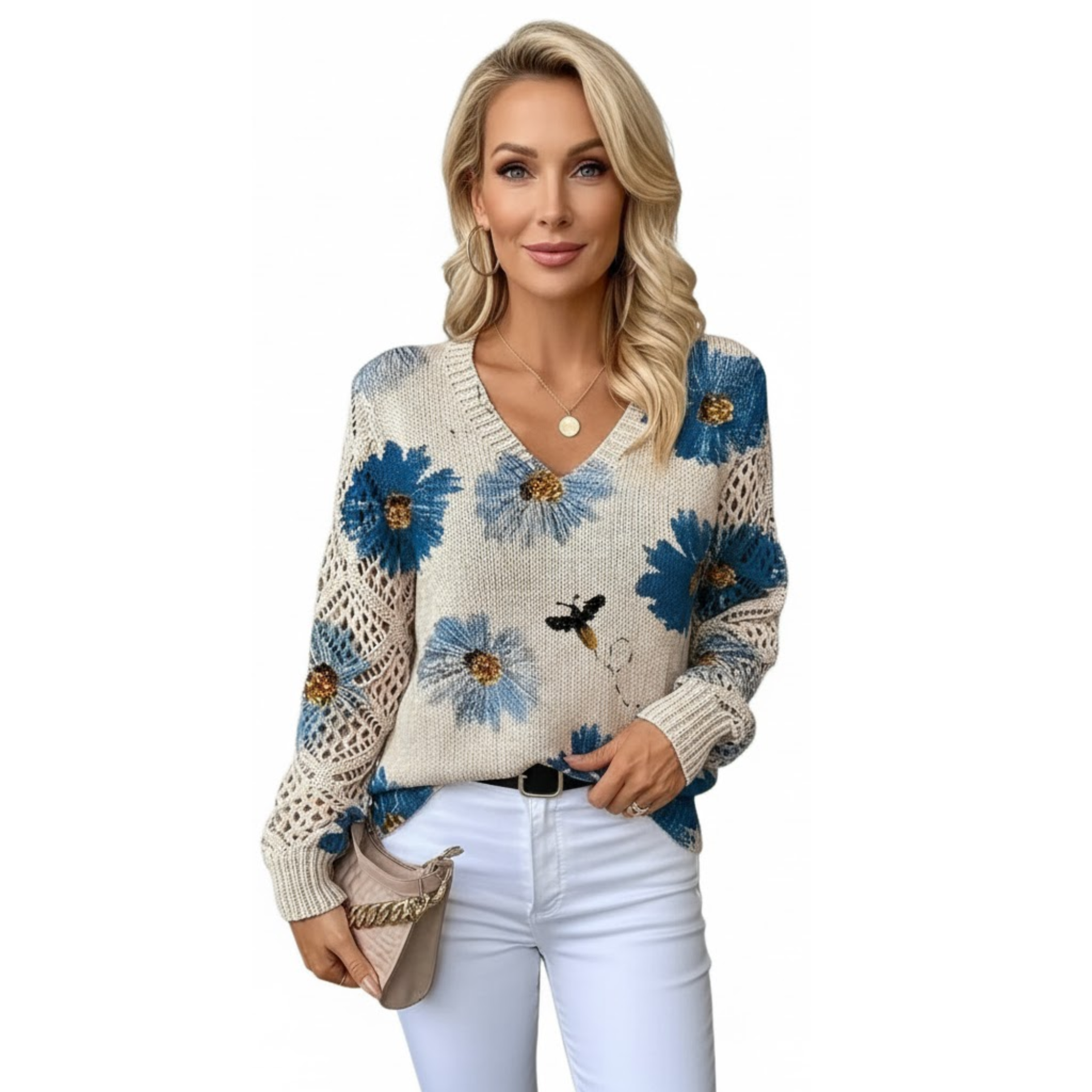Damenpullover mit Blumenmuster und Häkel-Details