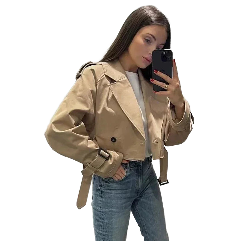 Kurzer Damen Trenchcoat mit Gürtel und verstellbaren Ärmeln